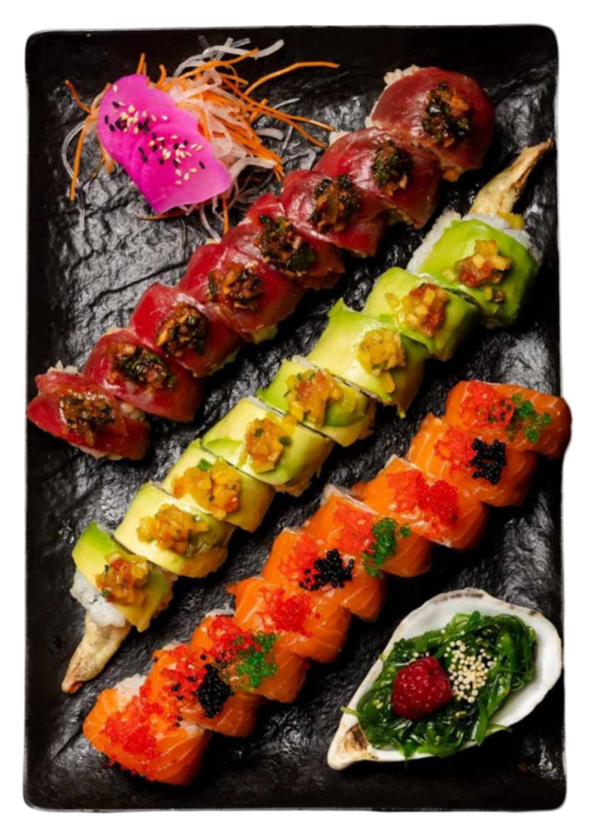8 kaczka z mango 8 tuńczyka z salsą kolendrową 8 dragon maki 8 łosoś z truflami 6 tatar z łososia w tempurze 8 mango duck 8 tuna with coriander salsa 8 dragon maki 8 salmon with truffles 6 salmon tartare in tempura